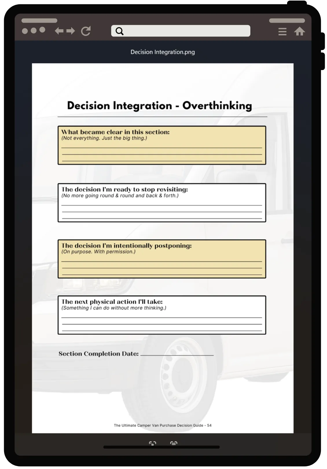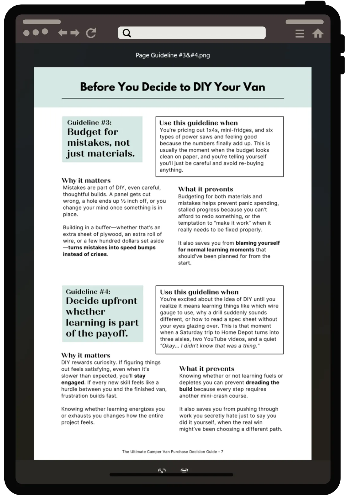 Print-friendly format so you can mark it up, flag pages, lay it out next to listings, and physically use it while touring vans or talking through spec sheets and inspection notes and think clearly.